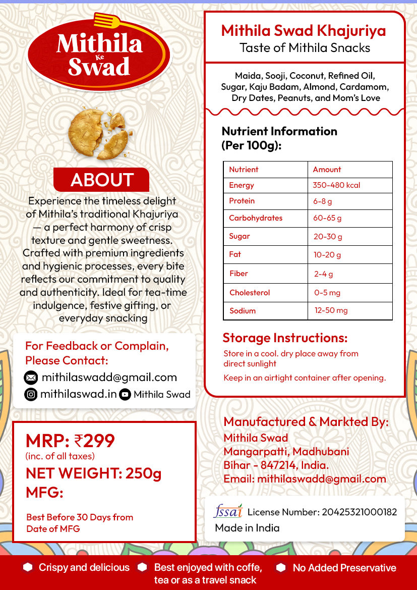 At Mithila Swad, we bring you snacks that are rooted in tradition and made with modern hygiene standards. Our focus is on purity, quality, and affordability. Whether it's Khajuriya or other regional delicacies, every product is made with care—free from added preservatives and available throughout the year.
